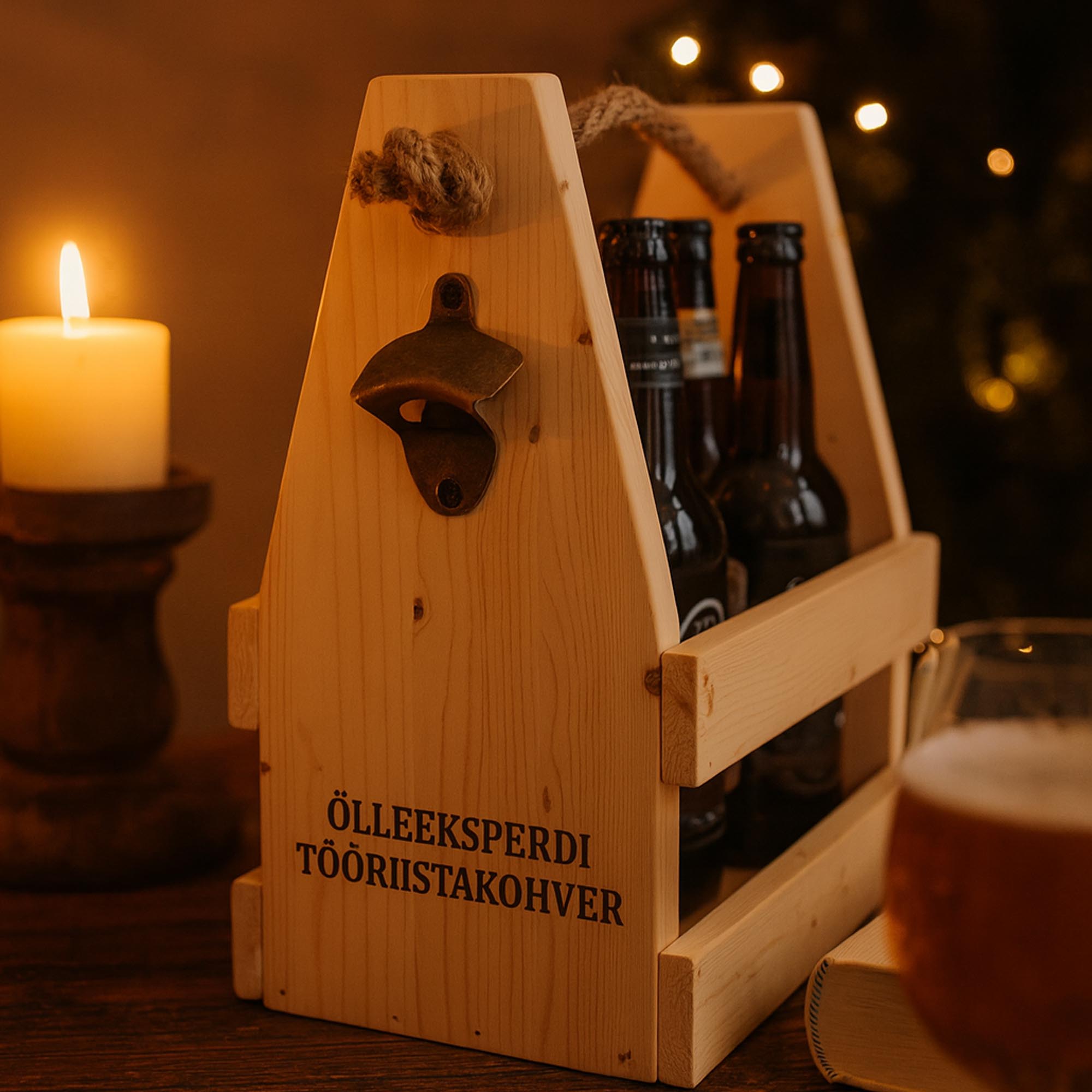 Meie täispuidust käsitööna valmistatud õllekandjal on tugev köiest käepide hõlpsaks kandmiseks. Sisseehitatud metallist pudeliavaja tagab, et olete alati järgmise joogi jaoks valmis. Praktiline kingiidee, mis näeb...