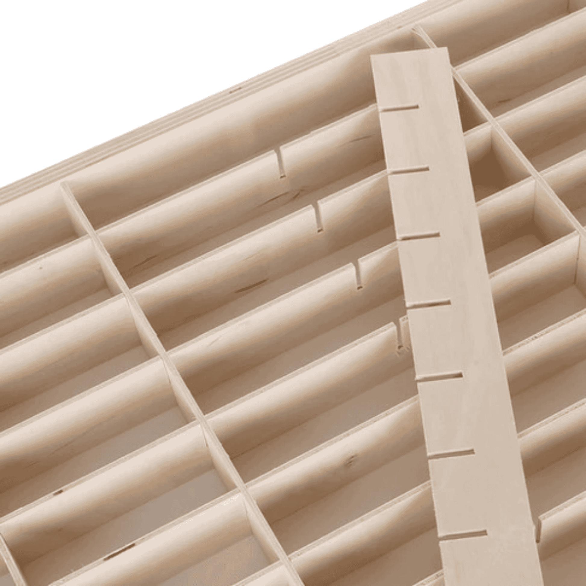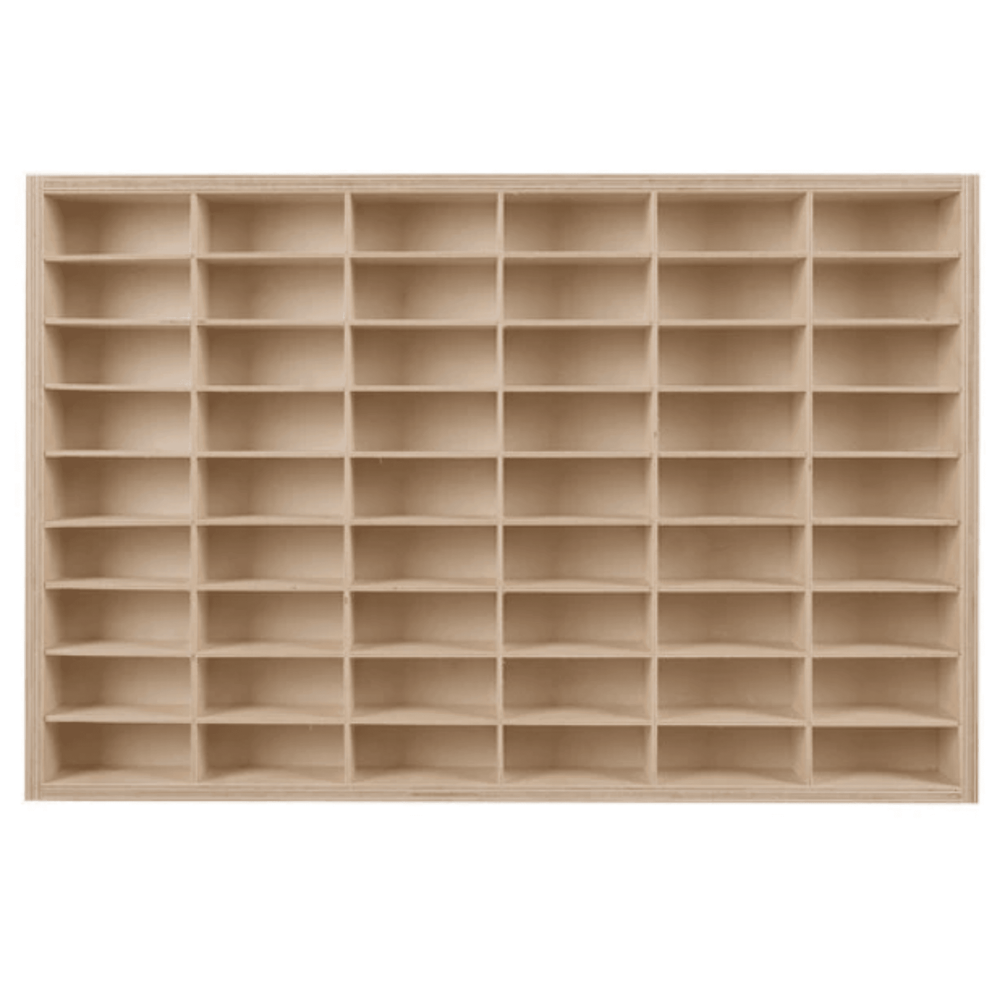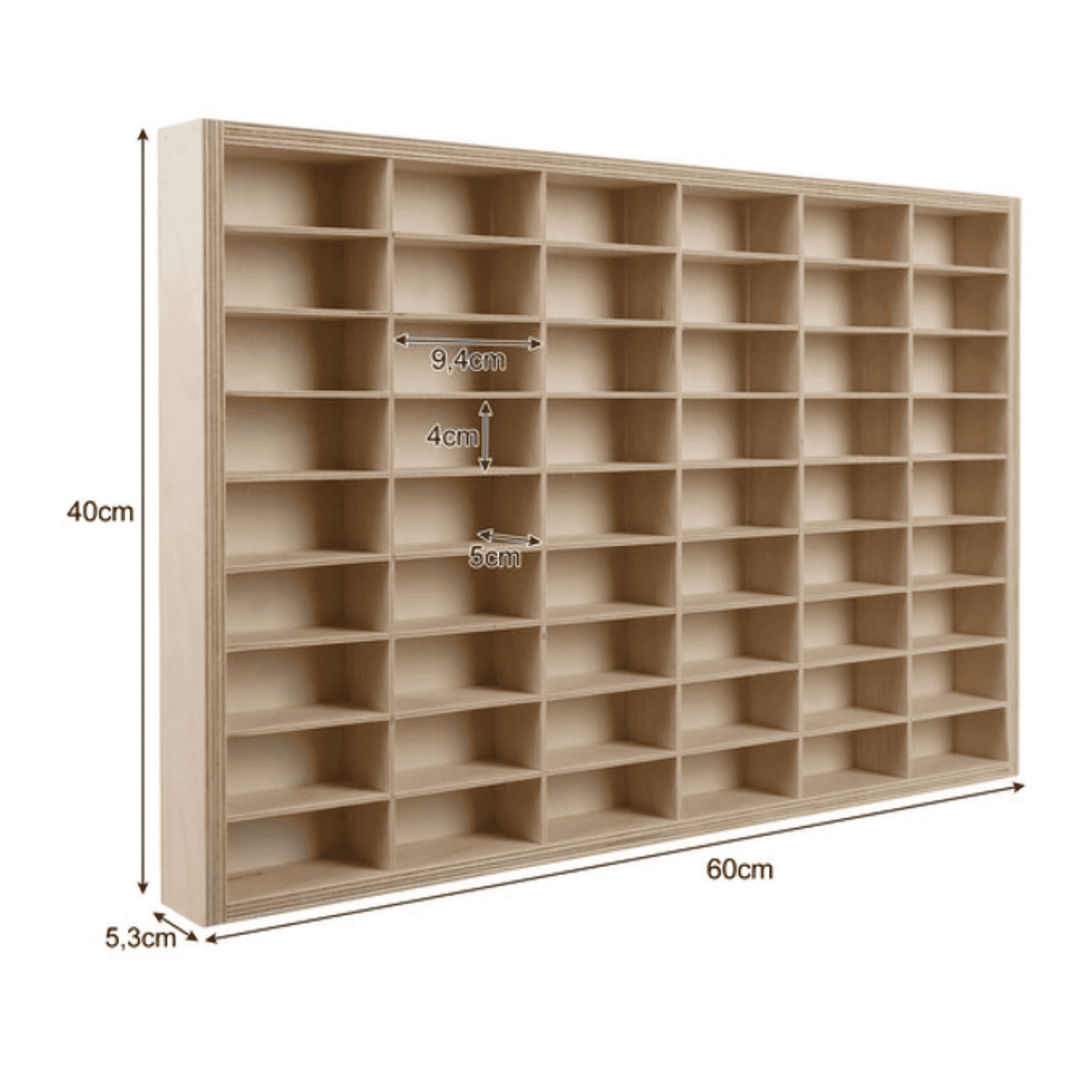 Riiul on valmistatud vastupidavast vineerist naturaalses männivärvis. Vaheseinad on eemaldatavad, mis võimaldab teil sahtlite suurust reguleerida vastavalt erinevatele mänguasjadele või väljapanekuvajadustele. See paindlikkus muudab riiuli kasulikuks autode, kollektsiooniesemete ja muude väikeste esemete jaoks.