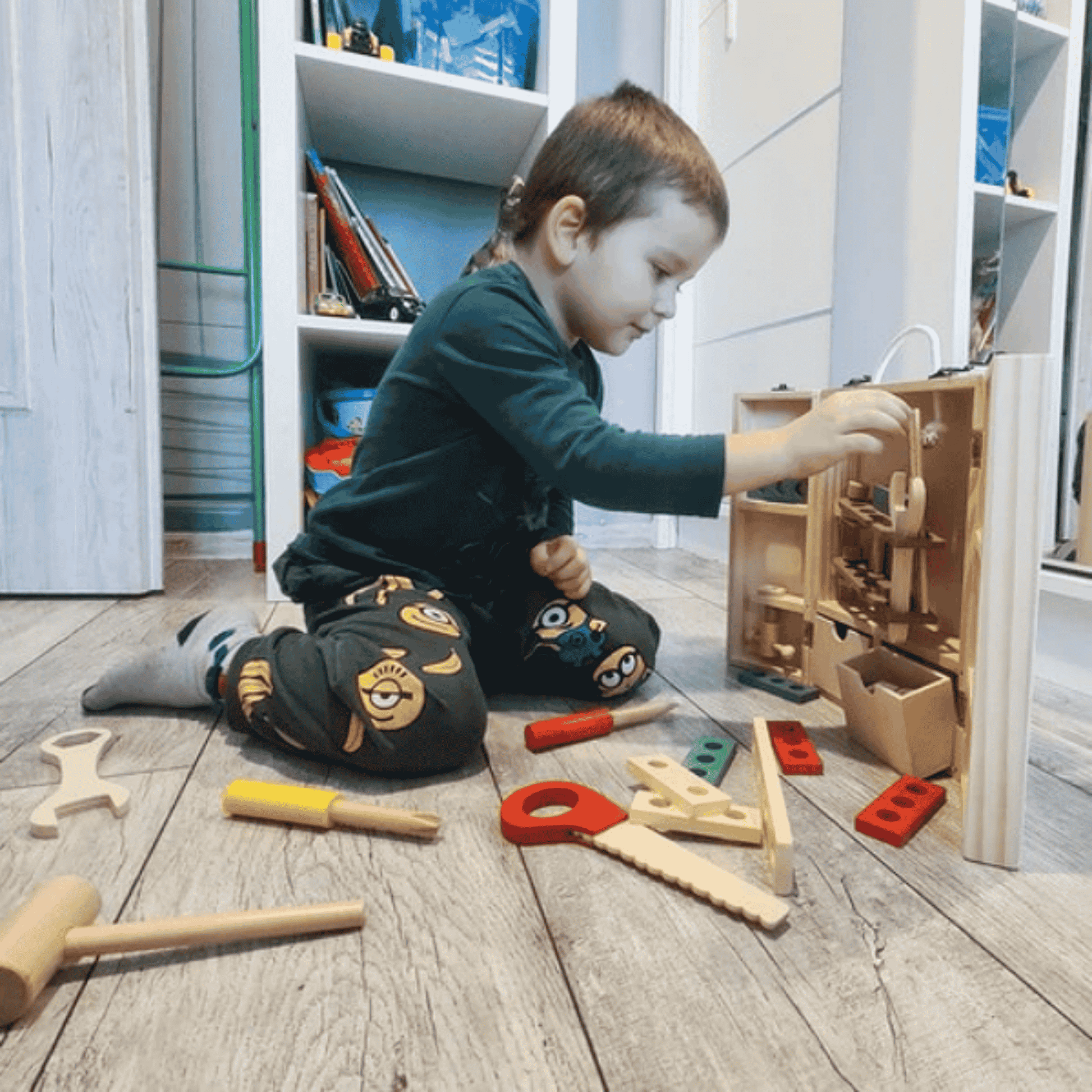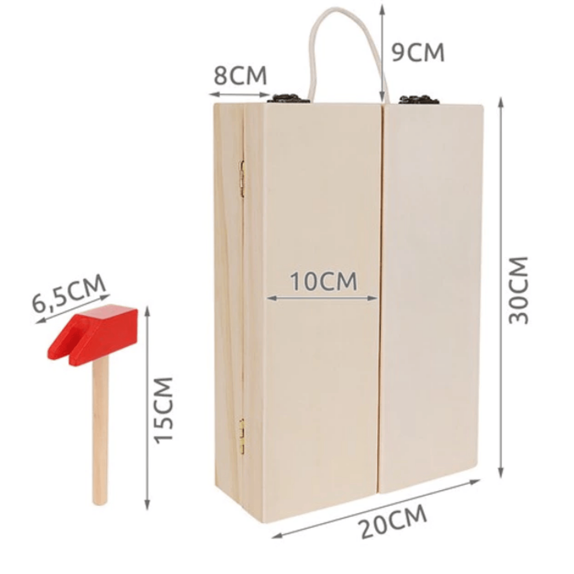 Vastupidavast puidust valmistatud ja lapsesõbraliku värviga värvitud mänguasi on ajatu valik. Puidust mänguasju hinnatakse nende loomuliku ilu, vastupidavuse ja ohutute materjalide poolest. Kuna tööriistad ja karp on valmistatud naturaalsest puidust, ei puutu lapsed kokku kahjulike plastidega – isegi kui nad panevad mänguasja suhu.