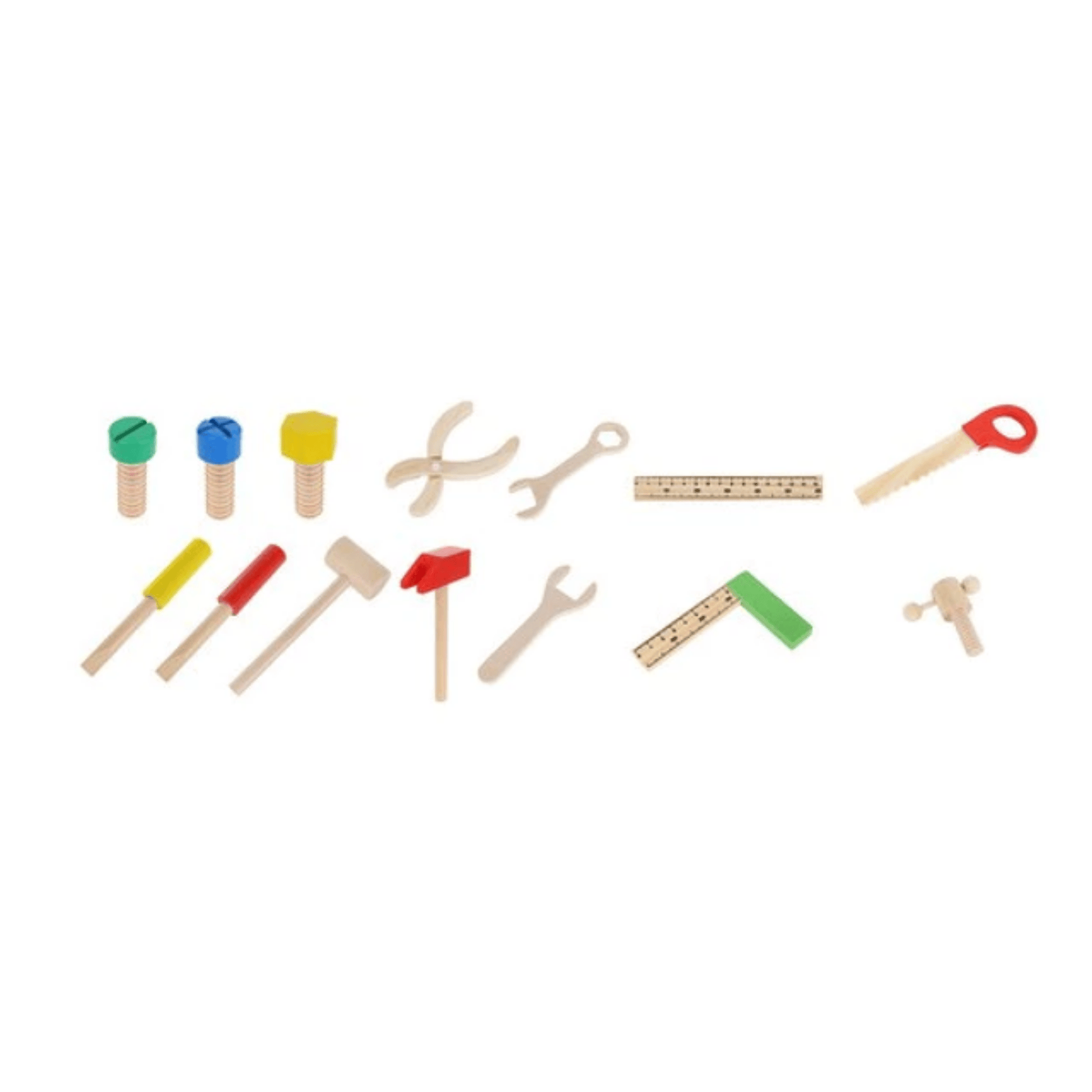 Komplekt sisaldab vastupidavat puidust kasti ja laia valikut tarvikuid: kruvisid, mutreid, saagi, haamreid, aukudega laudu, kruvikeerajaid, tangid, joonlauda ja nurgi. Karbil on paks puuvillasest nöörist käepide, mis teeb selle lastele kõikjale kaasaskandmise lihtsaks. Karbi sees on palju sektsioone ja kohti, kus iga tööriista saab korralikult hoiustada.