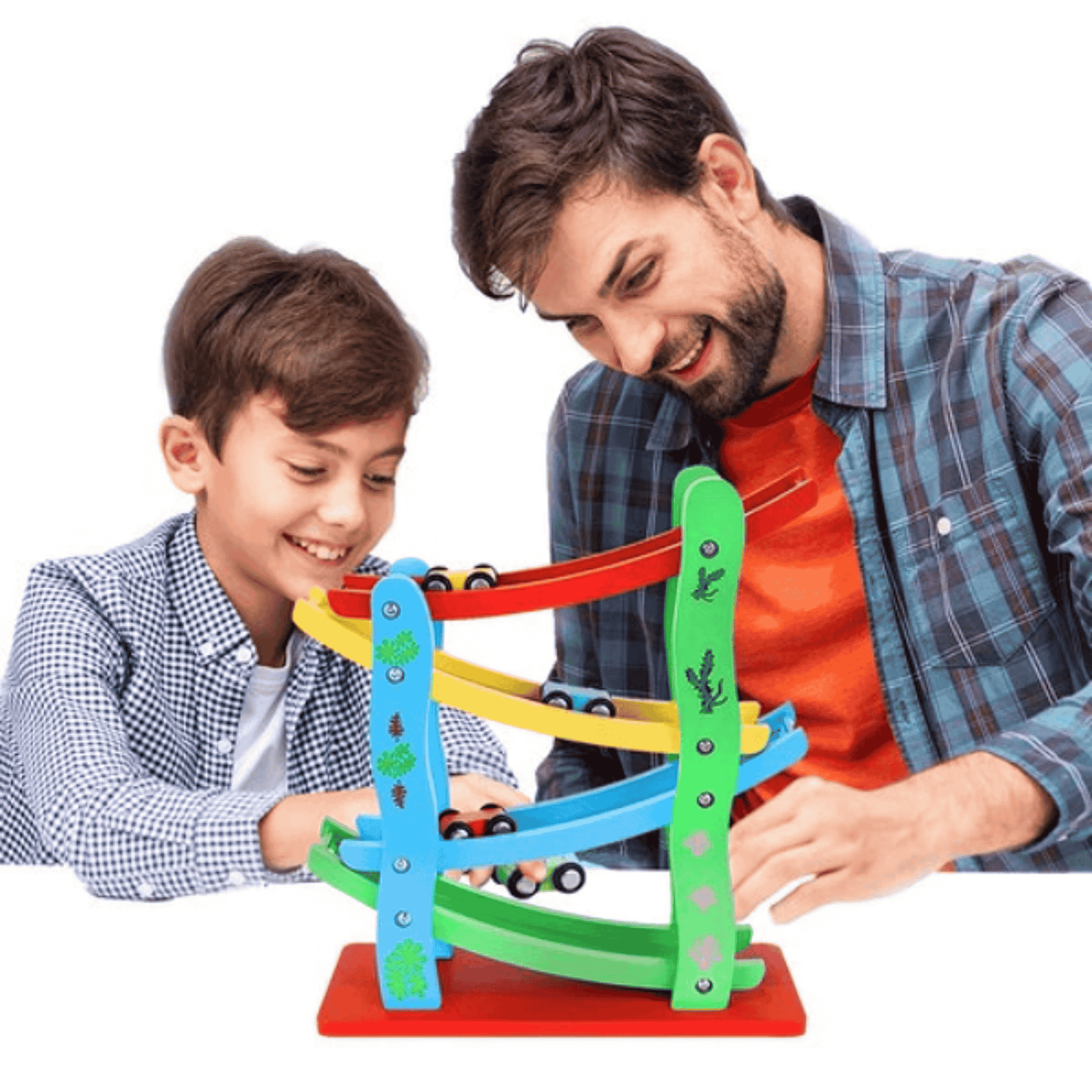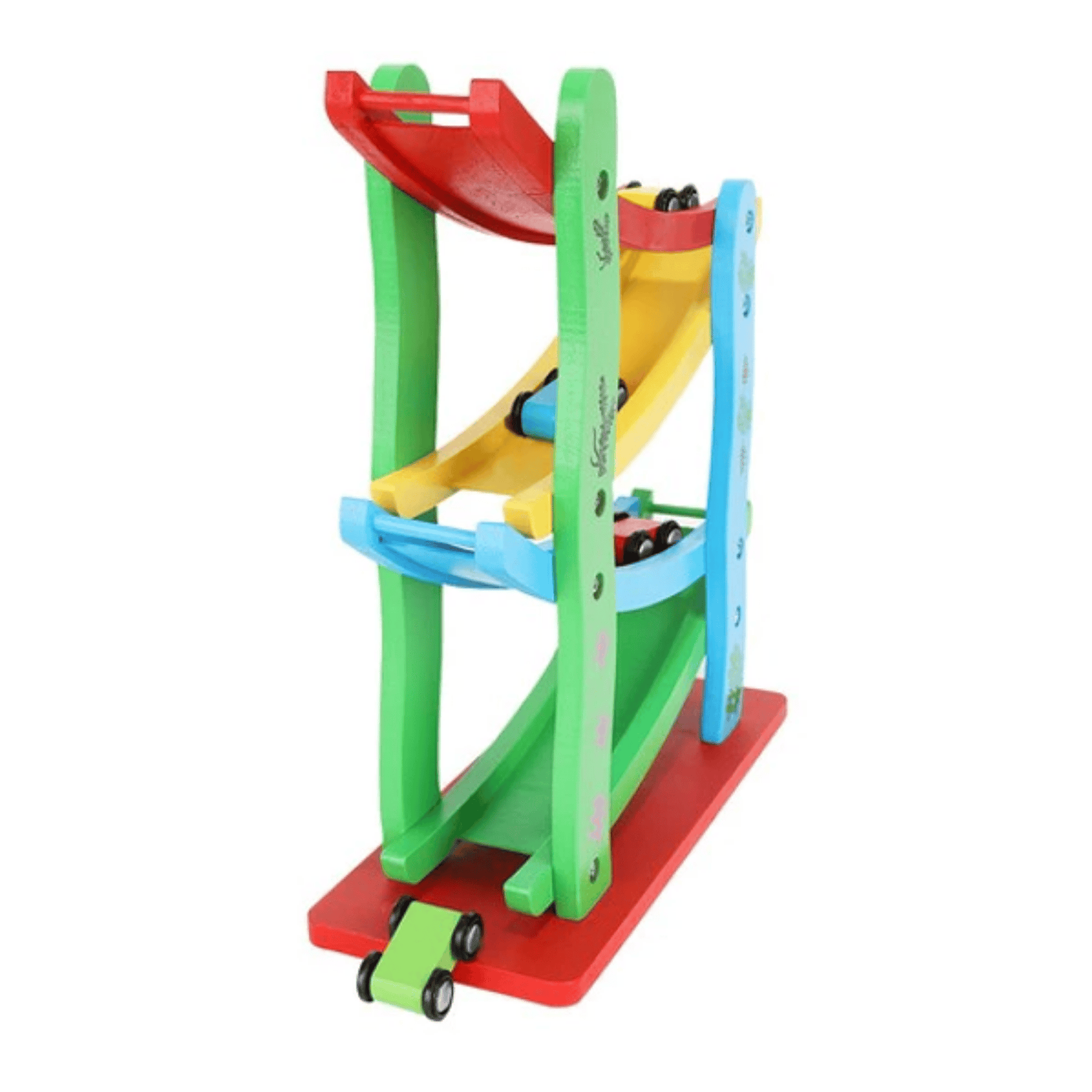 Komplekt sisaldab 5 osa: ühte liumäge nelja rööpaga ja nelja puidust autot rohelise, sinise, punase ja kollase värviga. Kõik osad on valmistatud puidust ja värvitud lapsesõbraliku värviga, muutes selle ohutuks ja keskkonnasõbralikuks alternatiiviks plastmänguasjadele.
